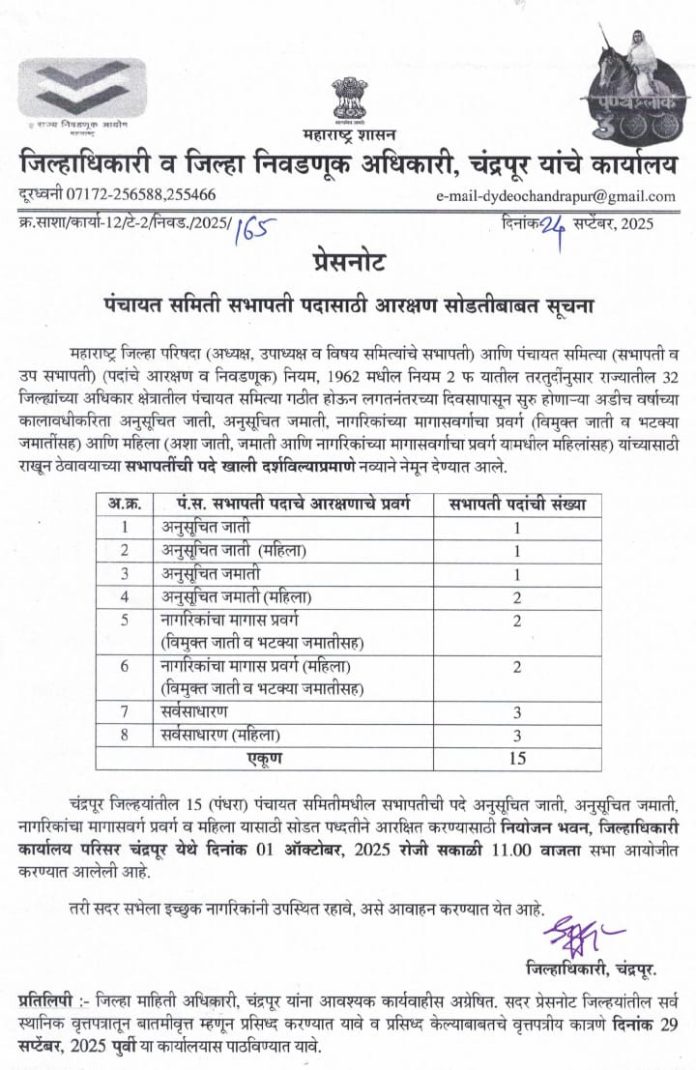चंद्रपूर : जिल्हाधिकारी व जिल्हा निवडणूक अधिकारी, चंद्रपूर यांच्या वतीने जिल्ह्यातील 15 पंचायत समित्यांतील सभापती पदांसाठी आरक्षणाची सोडत जाहीर करण्यात आली आहे. महाराष्ट्र जिल्हा परिषद व पंचायत समित्या (अध्यक्ष, उपाध्यक्ष, सभापती, उपसभापती) आरक्षण व निवडणूक नियम 1962 मधील तरतुदीनुसार ही प्रक्रिया राबविण्यात आली.