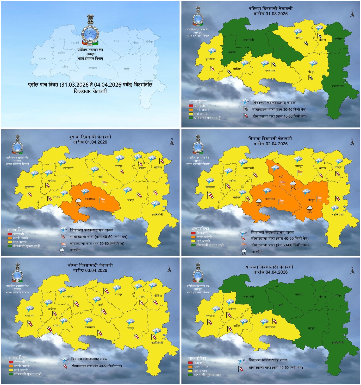 चंद्रपूर, दि. 31 : नागपूर प्रादेशिक हवामान केंद्राने दिलेल्या सूचनेनुसार चंद्रपूर जिल्ह्यासाठी दिनांक 1 व 3 एप्रिल 2026 रोजी येलो अलर्ट तर 2 एप्रिल रोजी ऑरेंज अलर्ट जारी करण्यात आला आहे. या कालावधीत जिल्ह्यात काही ठिकाणी विजांच्या कडकडाटासह गडगडाटी वादळ, सोसाट्याचा वारा (ताशी 40 ते 50 किमी वेगाने) तसेच गारपीट होण्याची शक्यता हवामान विभागाने वर्तविली आहे.
